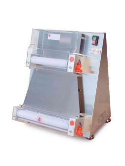 Две пары валков длинной 42 cм. Напряжение - 220 В. Мощность - 0,37 кВт. Габариты (ДхШхВ) - 550x365x750 мм., Корпус устройства выполнен из нержавеющей стали.Вес заготовок 210-700 гр., пицца Ø 26-40 см...