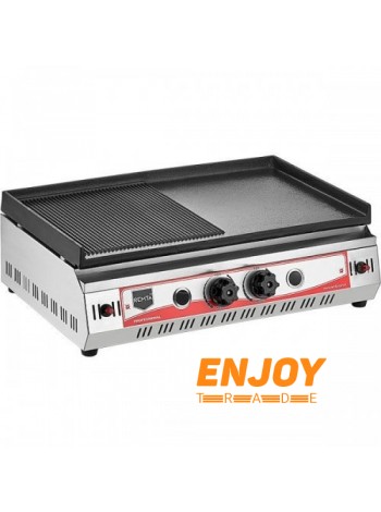 Тип поверхности - гладкая+ребристая. Материал рабочей поверхности - чугун. Пьезоподжиг 2-х раздельных зон. Автоматическая система отключения огня.