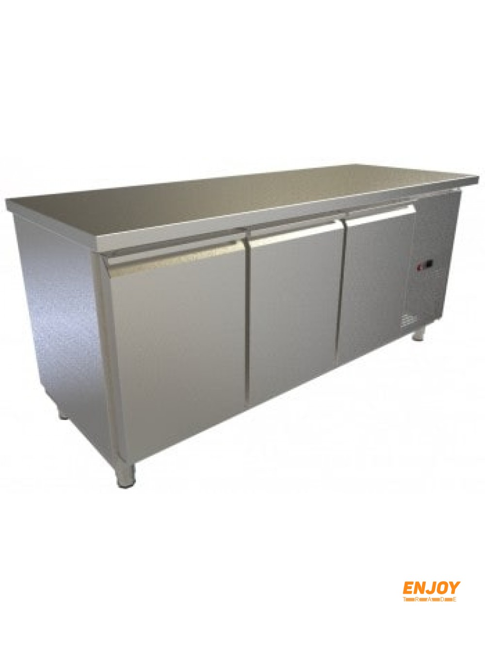 3 двери. Нержавеющая столешница. Температура окружающей среды +35 ˚С. Принудительное охлаждение. Встроенный агрегат, извлекаемый для обслуживания.