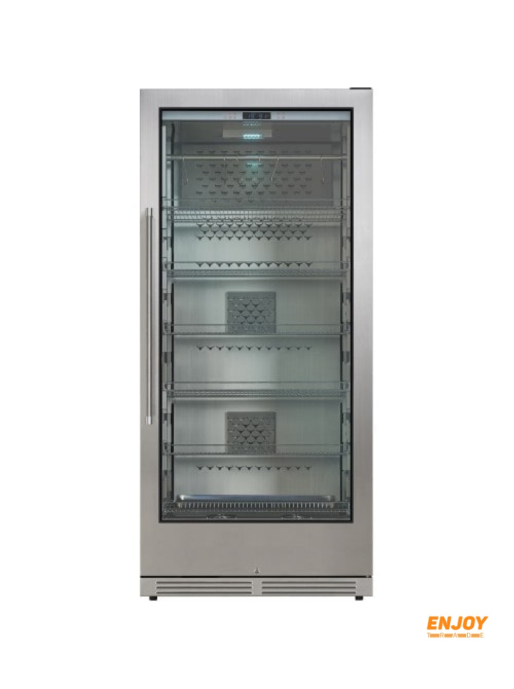 Дверь с 3-х слойным Low-e стеклом в нерж. раме с серебристым покрытием. Алюминиевая ручка. Замок. 6 нерж. полки 680х480 мм с бортиками.