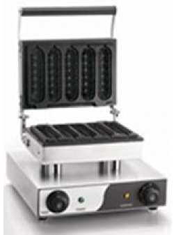 Габарити  (ДхШхВ) - 410х385х315  мм. Напруга - 220 В.  Потужність - 1,5 кВт. Чавунні прес-форми з 5 отворами для сосисок у тісті. Матеріал корпусу - нержавіюча сталь. Розмір робочої по..