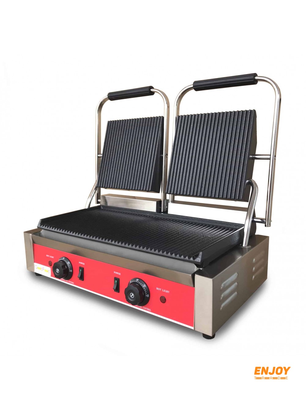Тип поверхні - верх і низ ребристі. Верхня плита фіксується в будь-якому положенні. Два регулятора потужності. Діапазон робочих температур - від 50 до 300 С.