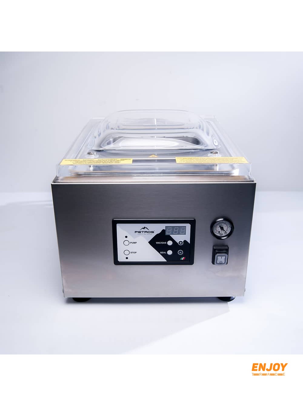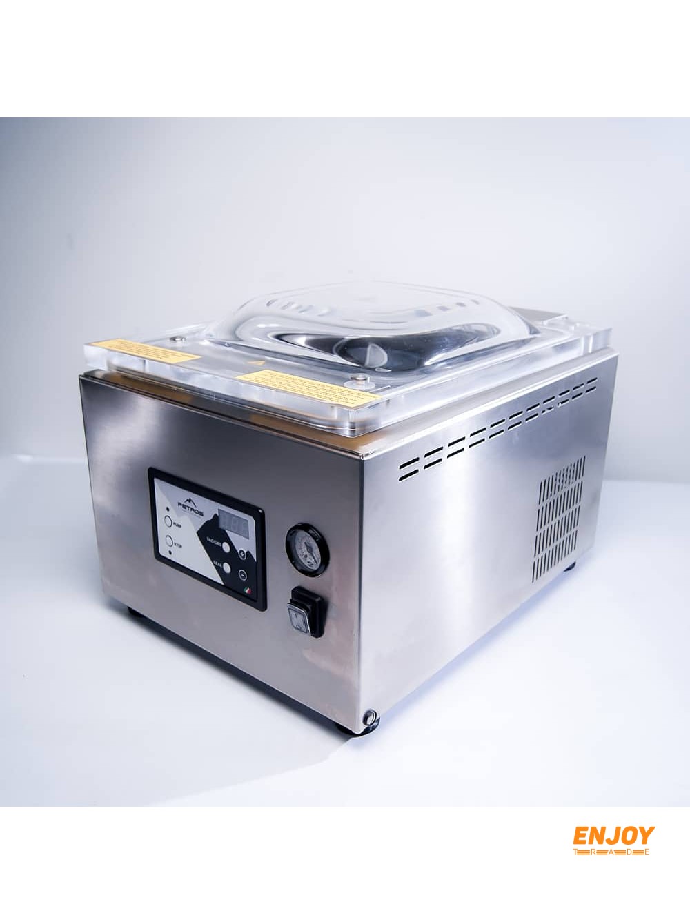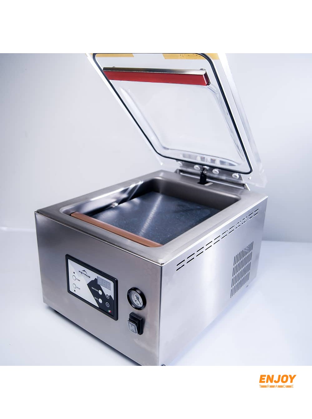 Корпус виконаний з нержавіючої сталі. Купольна кришка. Таймер. Електронна панель управління, можливість регулювання ступеня стиснення продукту.