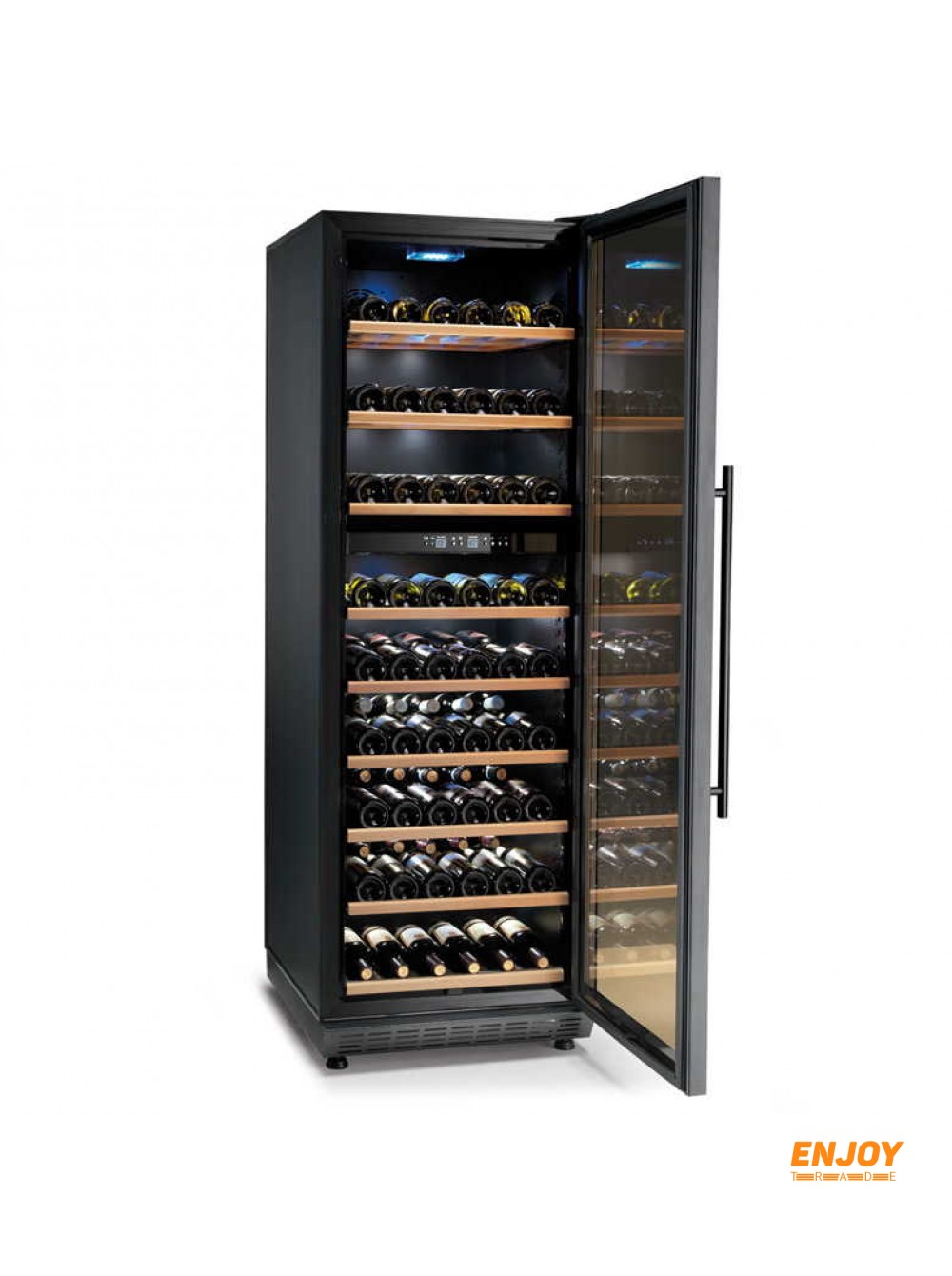Двері з подвійним загартованим склом і замком. 2 охолоджувані зони. Висувні дерев'яні полиці.Цифрові сенсорні органи управління. Регулювання термостата в градусах °C або °F. Дисплей і світлодіодне внутрішнє освітлення.