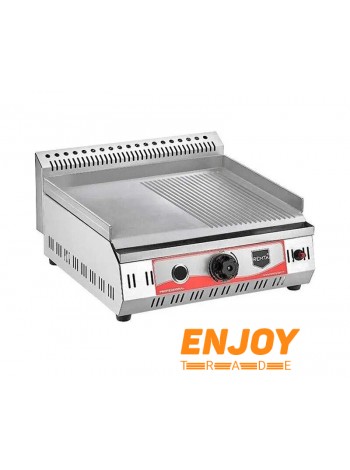 Тип поверхности - 1/2 гладкая + 1/2 рифленая. Материал рабочей поверхности - нержавеющая сталь. Пьезоподжиг. Автоматическая система отключения огня.